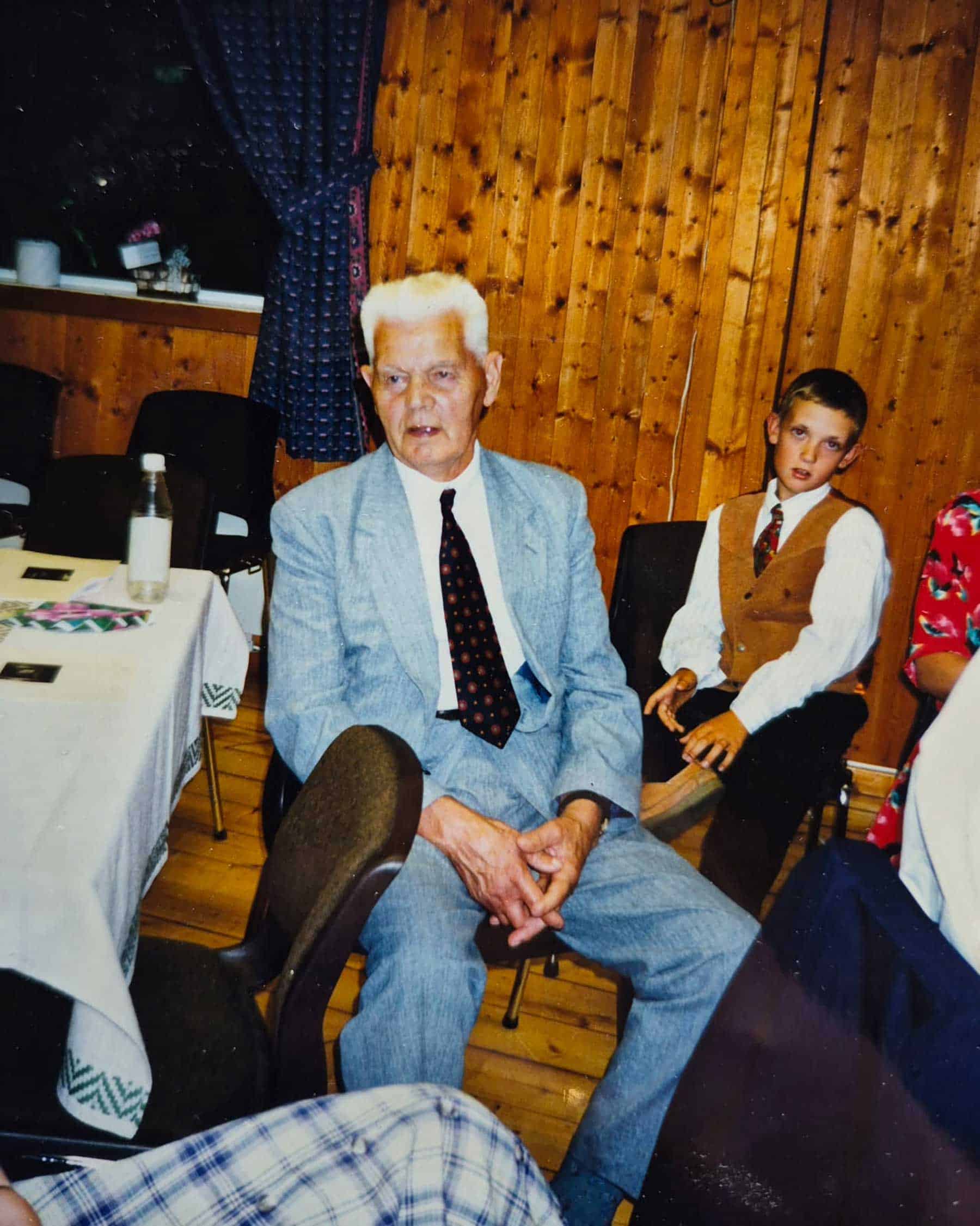BIRISANG: Godfred Lindokken skrev på 70-tallet en Birisang som familien har sunget ved høytidelige anledninger. Barnebarnet Stian Lindokken (som veldig ung på bildet) har tonesatt teksten på nytt ved bruk av KI.