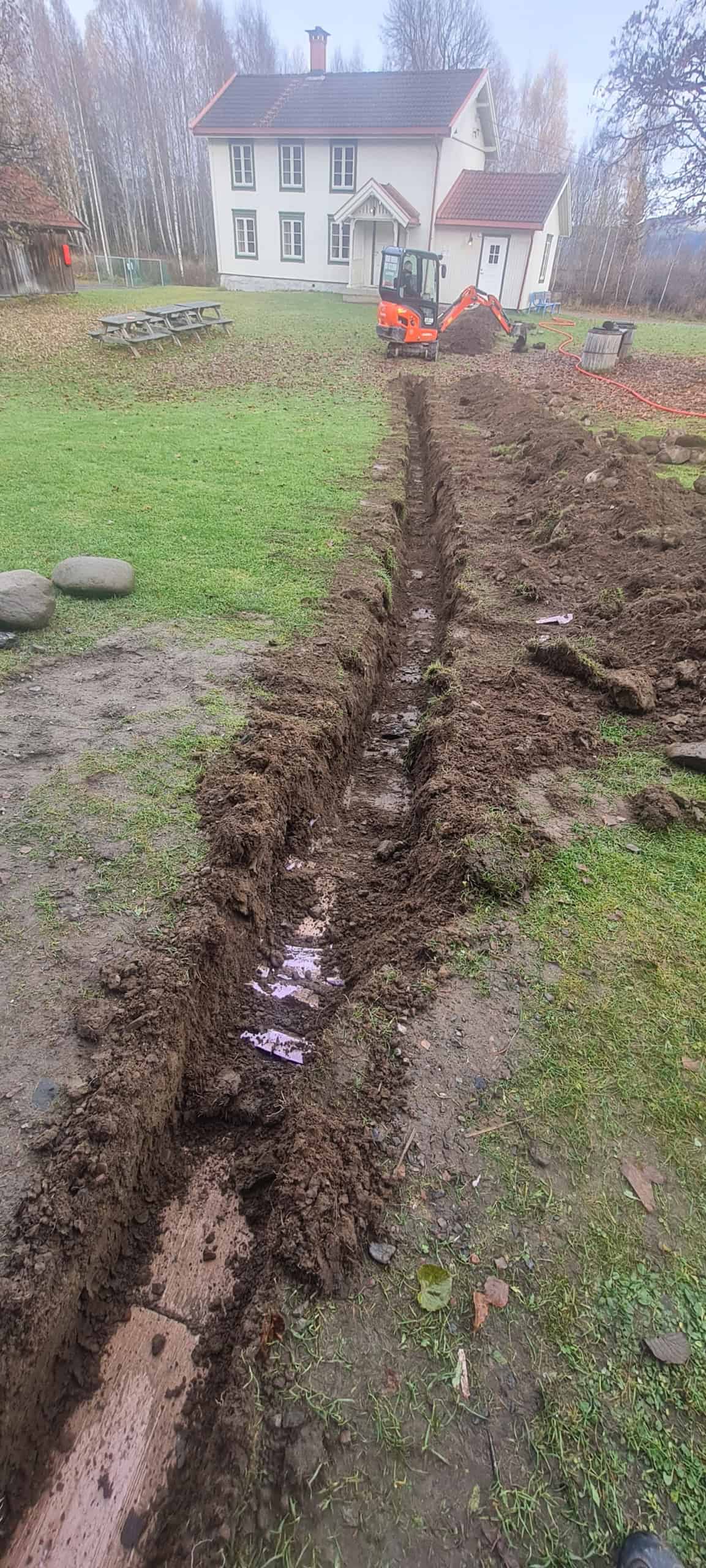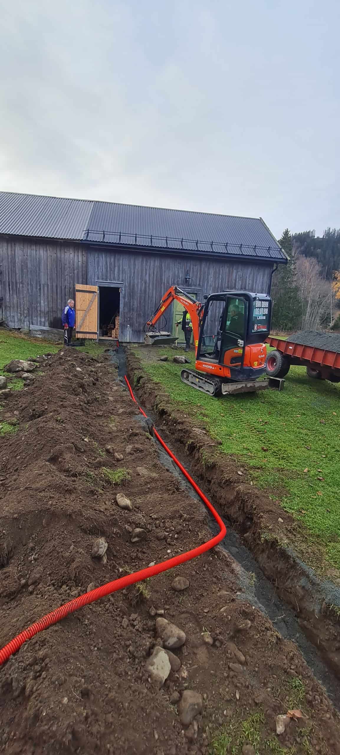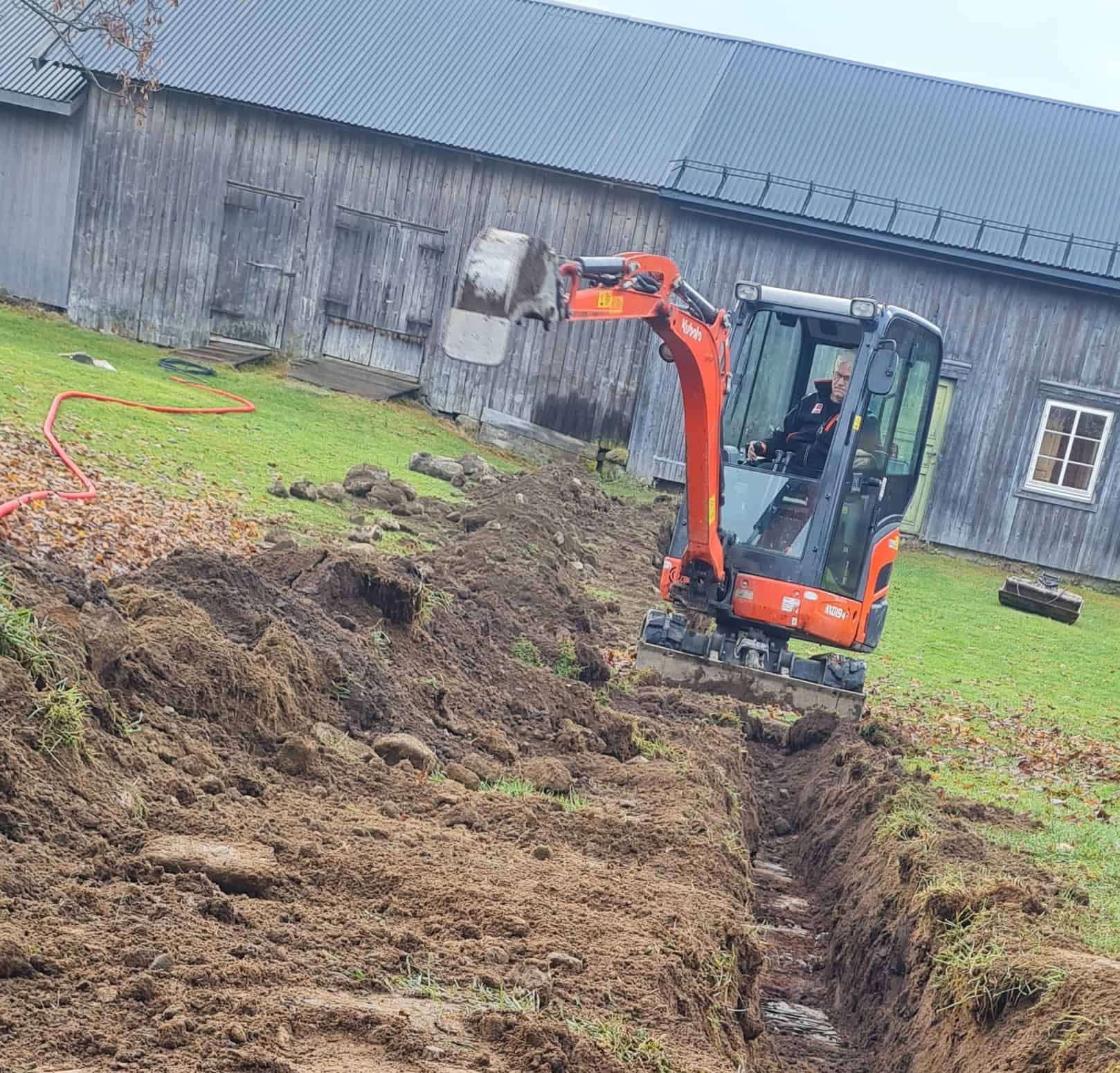 Og her kommer de virkelig gode hjelperne, Rune Slaatsveen stilte opp med gravemaskin, traktor og hengerlass med kabelgrus. Torsdagsklubben har i Geir Bekkelund sin egen, erfarne gravemaskinkjører som uten å tenke seg om sa ja til å gjøre en ganske omfattende gravejobb. Trond Strand i Eliten Elektro stilte atter en gang opp for å fikse tilkoblingen, så nå er det strøm igjen på Myrvang.