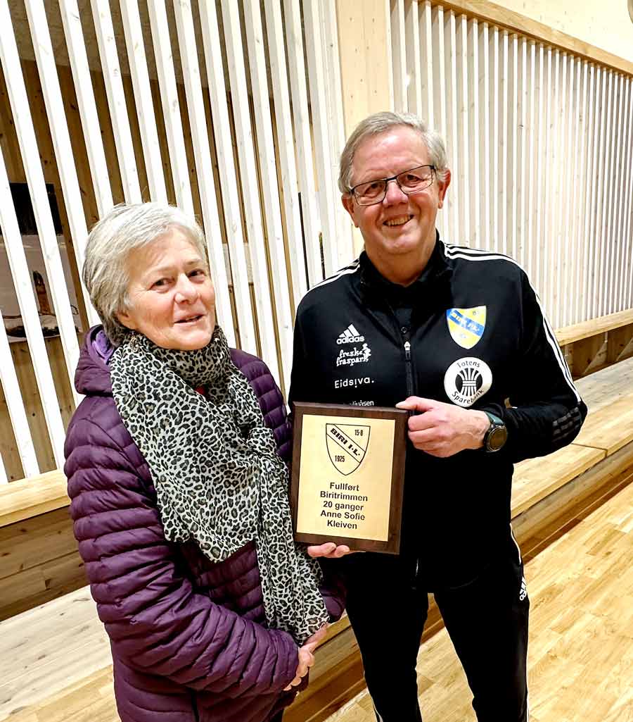 Plaketter fikk Gerd Sandnes, Torunn Sørum og Jan Olav Bilit for å ha gjennomført Biritrimmen 10 ganger. Kveldens desidert største og mest ettertraktede plakett gikk til Anne Sofie Kleiven. Hun har gått Biritrimmen hvert eneste år, og fullført alle løypene i disse årene, altså hele 20 ganger. – Det blir mange kilometer det, sa Austad, – og en rekord som så langt er uslåelig. Kleiven på sin side mente det var lite å lage oppstyr om, – jeg er jo pensjonist og har godt tid til å gå, smilte hun og måtte innrømme at det likevel var stas å få denne æresbevisningen fra Biri IL og Biritrimmen.