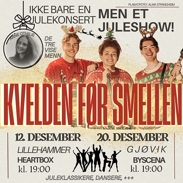 De tre vennene har, sammen med Alma og Inga, alt ansvar for det hele. Det er de selv som bærer alle kostnader, har stått for koreografi, manus og regi. De har produsert alt selv, med Jørgen som produsent. – Som vi sa, dette er 100% ungdomsdrevet, minner han om, – av ungdom for hele familien. For det er et familieshow de invirerer til fredag 12. desember, med rimelige billetter. – Vi tar bare 180 kroner billetten, sier Magnus, – og kommer det 150 publikummere er vi berget økonomisk. De kjører to show, et på Heartbox på Lillehammer og ett på Byscena i Gjøvik. – Showet på Gjøvik er uken etter, den 20.desember, sier Jørgen, som selv er fra Gjøvik. Fridtjof er fra Lillehammer og Magnus fra Biri. – Da passer det bra med begge byene, legger Fridtjof diplomatisk til. En del billetter er allerede solgt. – Vi selger også billetter i døra, reklameres det, – for de som bruker lang tid på å bestemme seg. Showet mener guttene er familie- og barnevennlig, det varer en drøy time og begynner kl. 19.00. – Er du klar for latter, tårer, gåsehud og konfetti må du bare komme, avslutter 17-åringene.