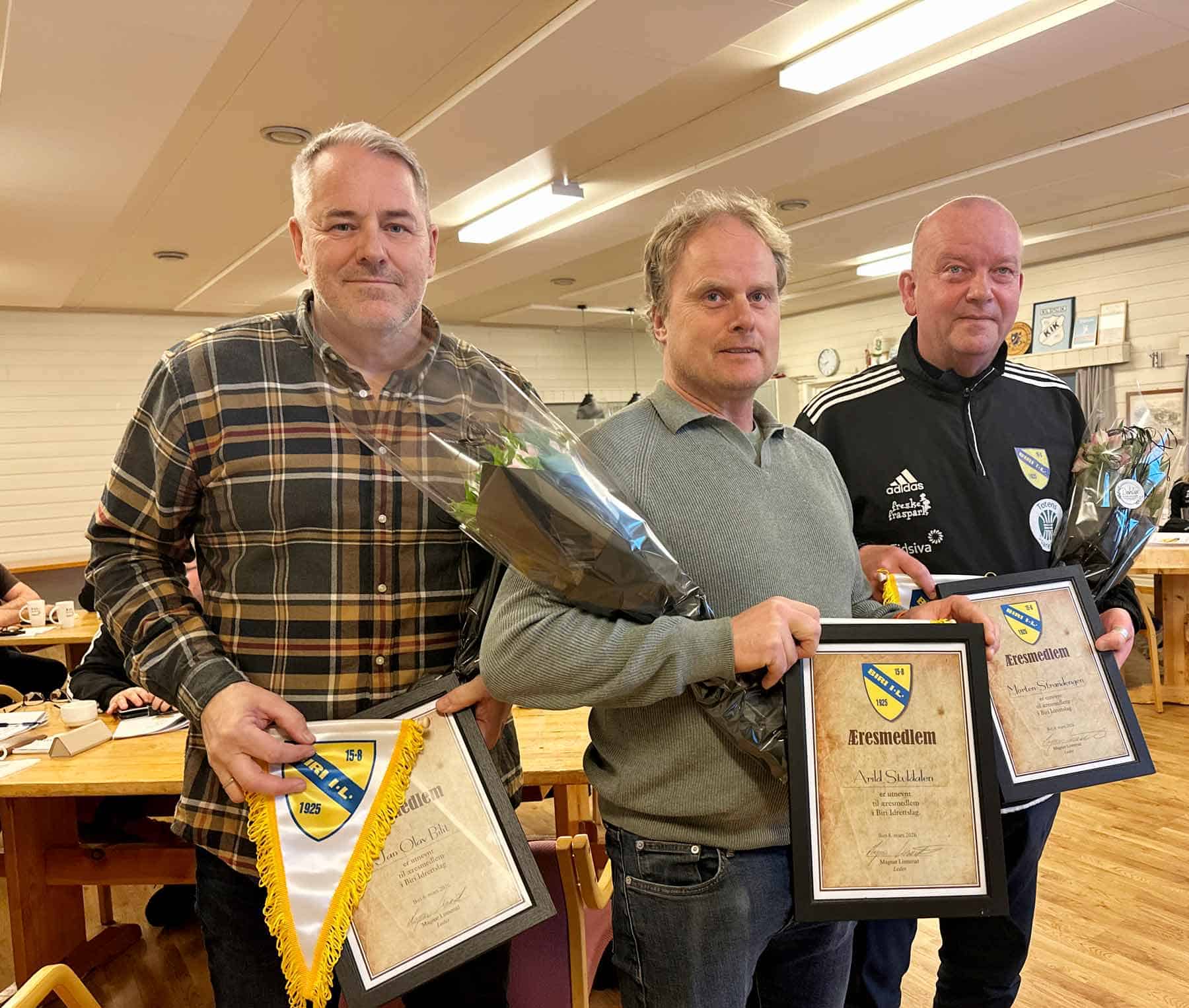 ÆRESMEDLEMMER: Tre stolte og nye æresmedlemmer i Biri IL, fra venstre Jan Olav Bilit, Arild Stuldalen og Morten Strandengen.