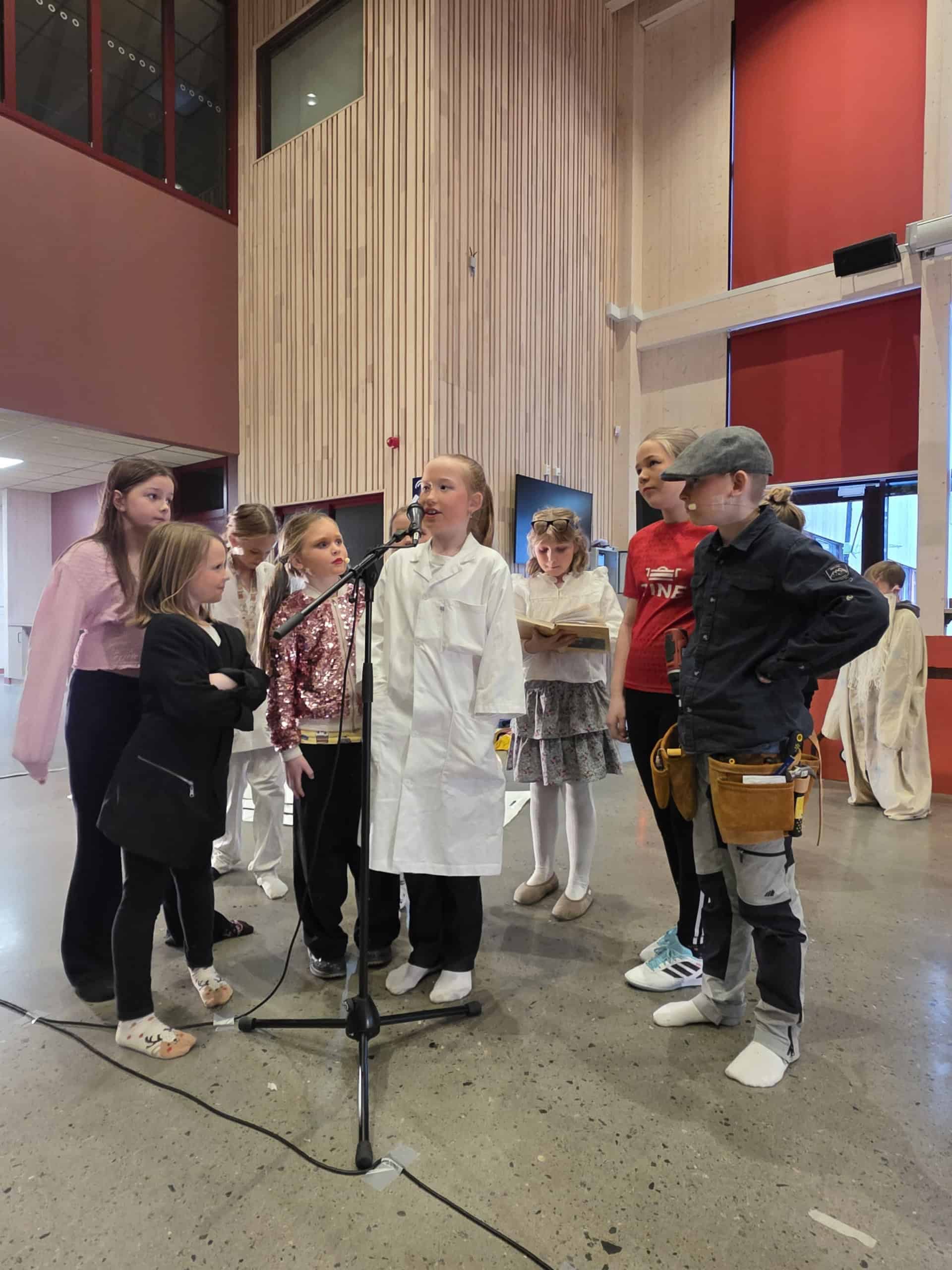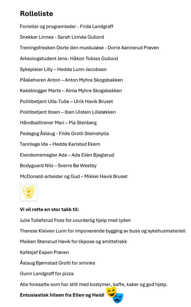 Latteren satt løst både på scenen og blant publikum denne søndagen. Instruktører var Heidi Skogsbakken og Ellen Rieb. – Vi vil rette en stor takk til alle som kom og så på, sier de. Stykket er skrevet ut fra innspill fra ungene og ispedd litt Monty Python-inspirer humor fra instruktørene side. Dette slo svært godt an blant publikum.