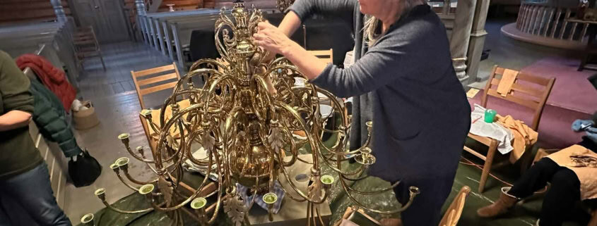 Både sanitetsforeningen og bygdekvinnelaget i Biri har mange jern i ilden. Og mange forskjellige oppgaver nå rett før jul, både hjemme og ellers rundt i bygda. En av disse oppgavene denne julen er å pusse lysekrone og messing i Biri kirke.